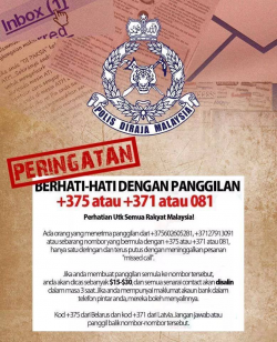 【更新】假消息!大馬警方澄清並未提醒:接聽+375,+371或081來電將被收高額費用+被盜取個人資料!