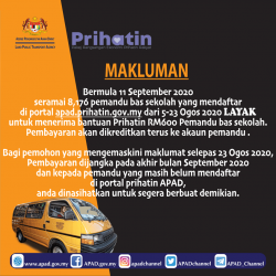 早前政府就宣布為駕駛學校大巴司機提供RM600的一次性特別援助金。而公共交通機構在今天(9月10日)就通過官方Facebook發表文告指出,在8月5日至23日期間,8176名向當局註冊的校車司機符合資格,可從明日起可獲得RM600的特別援助金。 MAKLUMAN :Bermula 11 September 202...... [閱讀更多]