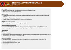 根據國家安全理事會(MKN)最新發布的標準作業程序(SOP),自本月3日開始的復業標準作業程序中,共有25種特定商業活動仍被禁止進行,當中包括按摩中心、賽馬及博彩業。 國安會發布的禁止進行活動,包括: 1.娛樂與休閑 ·電影院 ·卡拉OK中心 ·主題樂園 ·街頭表演 ·腳底按摩 ·娛樂中心 ·夜店(包括夜店內的餐廳) 2.節慶、遊行和集會 ·宗教遊行 ·安...... [閱讀更多]