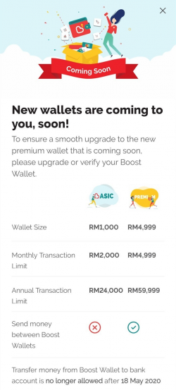 有在使用Boost電子錢包的用戶們,注意啦!從即日起,Boost為電子錢包設定了全新的條款,除了為電子錢包的限額提高之外,也取消了將電子錢包裡頭的現金轉載至銀行的功能給取消了! 根據Boost發布的詳情指出,Basic用戶的電子錢包現金限額將從原有的RM200增加至RM1000,此外每月消費也將從原有每月的RM1000增加至RM2000上限。 在Premium...... [閱讀更多]