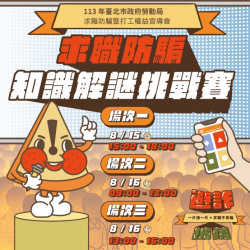 適逢求職旺季,臺北市政府勞動局祭出高額大獎1萬元禮劵,將於113年8月15日及113年8月16日假臺北市政府青年局國際會議廳(臺北市仁愛路一段17號6樓)舉辦3場「113 年求職防騙暨打工權益宣導會」,歡迎有意願接受求職防騙知識解謎挑戰賽的朋友們踴躍報名參加。 臺北市政府勞動局高寶華局長表示,本局配合內政部暑期青春專案進行一系列求職防騙措施與宣導,本年度宣導會呈現方式有別於...... [閱讀更多]