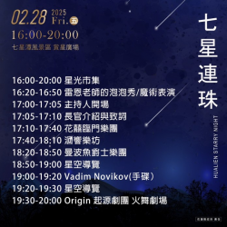 內容目錄 地點|花蓮七星潭風景區時間|| 2025.02.28 16:00 – 20:00 活動辦法 音樂 ✦ 星空 ✦ 火舞 ✦ 互動,在浩瀚星空下,一場結合 七星連珠奇景、爵士樂演奏、火舞劇場 的夢幻夜晚即將展開! 這場獨特的星光音樂會,將帶你進入宇宙的浪漫旅程,與家人朋友一起欣賞夜空下的精彩演出,感受音樂與星辰交織的魅力...... [閱讀更多]