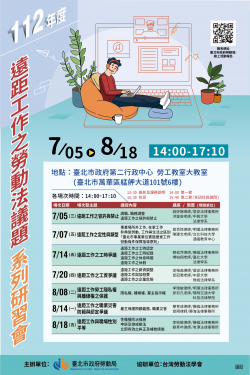 臺北市政府勞動局針對近年新興的遠距工作議題,與台灣勞動法學會合作,自7月5日起至8月18日舉辦「遠距工作之勞動法議題」系列研習會,共計7場次,限額130名,即日起開放報名至額滿為止,有興趣的民眾,請把握機會。 北市勞動局長高寶華表示,疫情改變了傳統工作型態,遠距工作的趨勢在後疫情時代裡,有著時間與空間的靈活彈性,但同時也衍生出新的勞動議題。為此,勞動局也在今(112)年2月...... [閱讀更多]