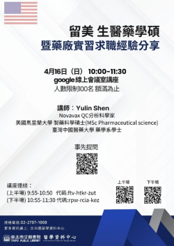 臺北市立圖書館留學資料中心於4月16日(日)10時邀請畢業於美國馬里蘭大學製藥科學研究所Yulin Shen講師,介紹留學動機與計畫申請、學校特色、在校打工分享、美國大華府區生醫藥產業概況、Astra Zeneca產學實習經驗、畢業後求職與Novavax工作心得等資訊。 美國馬里蘭大學(University of Mar...... [閱讀更多]