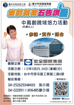 台中市政府勞工局為鼓勵中高齡朋友投入就業市場,建構銀髮友善就業環境,積極和企業合作,今年度將辦理5場次跨域培力課程、10場次職場體驗活動,體驗零售業、服務業、製造業等多元產業,活動全程免費,首場將於3月23日、24日與國內飲料包裝大廠宏全國際股份有限公司合作辦理,歡迎中高齡朋友踴躍報名! 勞工局長張大春表示,市長盧秀燕重...... [閱讀更多]