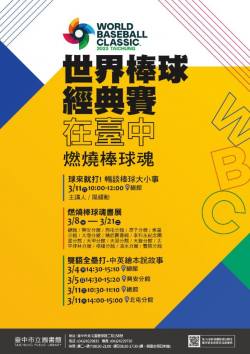 全球球迷引頸期盼的「2023世界棒球經典賽」(WBC)分組預賽將於3月8日至12日在台中洲際棒球場盛大登場,吸引國人高度關注,精彩可期;台中市立圖書館3月份特別規劃一系列與棒球相關的講座、書展、說故事及抽獎活動,邀請民眾除享受熱血球賽,也可透過閱讀認識棒球,一起用閱讀為中華隊加油! 台中市政府文化局表示,台中市立圖書館總...... [閱讀更多]