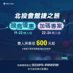 就是輕鬆省荷包,臺北捷運公司幫你賺到晚鳥住宿優惠價!即日起至年底止,預約當日或隔日19時至22時入住北投會館「捷之旅」,雙人房最低優惠1,000元起;此外,再推出「加碼專案」預約當日22時後入住,雙人房最低600元起,盡情享用安靜、舒適、乾淨的住宿環境。相關住房資訊可至北投會館官網。 ...... [閱讀更多]