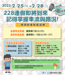【高雄訊】交通局依據過往數據整理今(112)年228和平紀念日連續假期(2月25日至2月28日)車流預測供市民朋友參考。連假第一日(2月25日)將出現返鄉車潮,市區幹道流量較高;而旅遊高峰則為連假第二、第三日(2月26日、27日),熱門景點包含駁二、旗津、壽山動物園等周邊流量約較一般假日增加10%。 交通局溫馨提醒,熱門...... [閱讀更多]