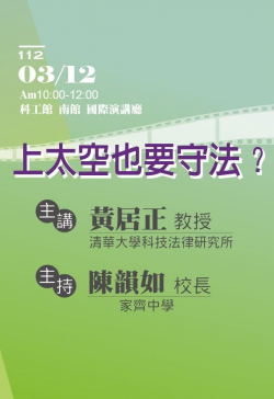 您知道外太空也有法律嗎?曾想過上太空需要守法嗎?由國科會連續補助第20年的週日閱讀科學大師講座,於112年3月12日上午10時邀請國立清華大學科技法律研究所黃居正教授主講「上太空也要守法?」,讓大家深入了解上太空所需要的法律。 黃居正教授表示,太空是人類的共享資源,任何國家都可以自由進行研究、開發與利用。太空活動所取得之...... [閱讀更多]