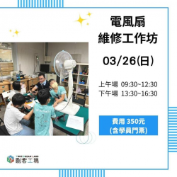 悶熱的天氣即將到來, 但家裡那台電風不給力嗎? 快來一起參加電風扇維修工作坊~ 訂製專屬你的風吧 – 電風扇維修工作坊 03/26 (日) 上午場 09:30~12:30 下午場 13:30~16:30 費用: 350元 (含學員門票) ...... [閱讀更多]
