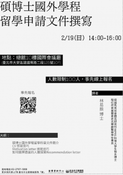 臺北市立圖書館留學資料中心2月19日(日)邀請畢業於德國科隆大學林易辰博士簡介碩博士生申請國外學程留學所需相關文件,如個人履歷(CV)、動機信(Motivation letter)、推薦信(Recommendation letter)、語言檢定(Language certificate);並簡述個人履歷撰寫技巧,學術上使用的履歷...... [閱讀更多]