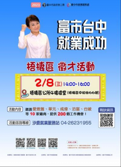 協助市民順利就業、廠商尋覓好人才,台中市政府舉辦「富市台中 就業成功」2月系列徵才活動,邀集鼎泰豐、味全食品、梧棲行旅等40家次廠商,辦理20場徵才活動,提供1,400個優質職缺,歡迎求職民眾踴躍參加。 勞工局長張大春表示,市長盧秀燕重視市民就業議題,積極推動「台中富市3」經濟策略,帶領市府團隊招商引資、強力媒合市民就業...... [閱讀更多]