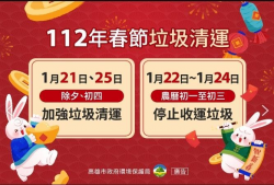 為迎接兔年到來,配合國人歲末「除舊佈新」年終大掃除習慣,高雄市環保局於今(112)年1月14日起至1月20日「環境清潔週」期間,全力加強清運年終掃除產生的廢棄物及資源回收物,讓市民朋友以清新整潔環境,歡歡喜喜迎接新的一年。 環保局長張瑞琿表示,配合國人年前大掃除的習慣,為加強服務廣大市民,各區清潔隊自1月14日起至1月2...... [閱讀更多]