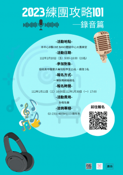 自己的練團成果自己錄!臺北市青少年發展暨家庭教育中心將於112年2月10日(星期五)開辦「2023練團攻略101─錄音篇」1日技能課程,課程全程免費,即日起至1月30日止,邀請高中職暨大專院校學生至青發家教中心活動官網報名(https://www.class.tcyd.gov...... [閱讀更多]