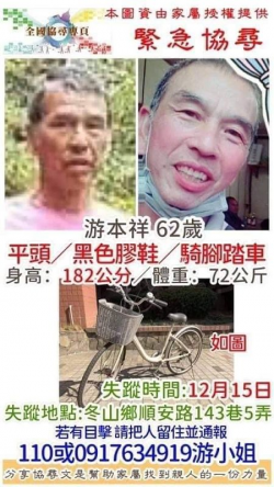 記者林周龍/羅東報導 宜蘭縣消防局12月19日接獲羅東警分局順安派出所轉報,現年62歲近3個月來有暈眩症游姓老翁,喜愛運動,工作之餘常去爬山、慢跑,12月16日上午下家中獨自騎著腳踏車出門,身穿著橘黑色短袖上衣及灰色長褲,就與家人失去聯絡,家人除在網路請求網友協助尋找之外,也向羅東分局報案,經警方調閱路口監視器後發現游姓老翁於16日12點20分騎乘腳踏車到達冬山鄉茅埔城古道登山口入...... [閱讀更多]