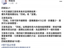 記者翁正杉/宜蘭報導 交通部長王國材今(11)日由鐵道局長伍勝園、台鐵局長杜微等人陪同到宜蘭,就高鐵站終站選址實地了解,但並未通知宜蘭縣政府及地方人士,而是在事後提供照片給台北媒體,其中就媒體報導指出部長說,現在四城站雖是小站,但高鐵站設在這裡,台鐵的高級列車也都會停靠,自然就變成大站,將來東部快鐵的點自然會設在這裡的,這讓宜蘭縣前議員林成功在臉書按讚並+1。 高鐵延伸到宜蘭終...... [閱讀更多]