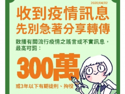 新聞中心/整理 華航機師染疫有本土案例出現,民眾都在關注中央疫情指揮中心訊息,但今(2)日就有「以陳時中指揮官名義發布之疫情訊息」,目前經中央疫情指揮中心澄清証明,這是「假訊息!」,請民眾勿再轉傳與散播,依「嚴重特殊傳染性肺炎防治及紓困振興特別條例」第14條,最高可罰3年以下有期徒刑、拘役或台幣300萬元罰金。 這幾日華航機師出現染疫事件,造成國內本土案例遽升,也引起民眾憂慮,...... [閱讀更多]