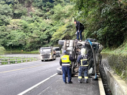 蘇花公路121.1公里處砂石曳引車彎道翻覆 駕駛無礙