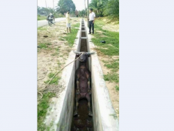 調皮牛隻滑落水溝萌樣 讓飼主哭笑不得