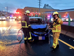新聞中心/整理 今(24)日傍晚5點20分許,國九警察巡邏車行經國五蘇澳交流道匝道出口處(南下54公里處),發現一部本田藍色自小客疑似車體漏油導致起火燃燒,吳姓男駕駛(37歲)發現火苗後緊張自撞內側護欄並著火,吳男即時跳下匝道旁水溝滅火,經警、消等合力搶救後,於5點31分撲滅火勢,但整部車已全毀,駕駛經送羅東博愛醫院救治無生命危險,但其背部及頭部有灼傷,詳細起火原因待消...... [閱讀更多]