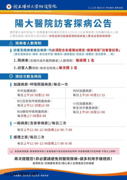 新聞中心/ 整理 新冠肺炎疫情影響,羅東博愛醫院為防疫做出決,自3月9日(星期一)起,凡探病、陪病家屬等。一律要在前一天12點前,上網填寫預約申請單,每時段限定人數1位。而陽大是要求探病、陪病民眾帶健保卡(或身分證/居留證)供人員查詢勾稽旅遊史。 羅東博愛醫院強調,3 月9日起,探病需於前日晚間12點前,上網填寫預約申請單,每時段限定人數1位,表單填寫綱址:http...... [閱讀更多]