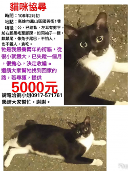 尋找貓咪~ 地點 高雄市鳳山區 Fengshan , Kaohsiung 【尋找貓咪~ 地點 高雄市鳳山區】 轉貼內容#高雄市鳳山區#協尋請大家幫幫忙聯絡電話 0917571761…https://twpetsearch.arlinks.net/2019/03/fengshan-kaohsiung_13.html ...... [閱讀更多]