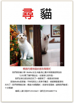 尋找貓咪~MoMo 地點 桃園市中壢區 Zhongli , Taoyuan 【尋找貓咪~MoMo 地點 桃園市中壢區】 轉貼內容聯絡電話 0912553667 0936887716…https://twpetsearch.arlinks.net/2019/02/momo-zhongli-taoyuan.html ...... [閱讀更多]