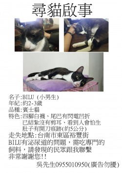 尋找貓咪~BILU 地點 台南市東區 East , Tainan 【尋找貓咪~BILU 地點 台南市東區】 轉貼內容麻煩台南的朋友有看到幫忙一下聯絡電話 0955010950…https://twpetsearch.arlinks.net/2019/01/bilu-east-tainan.html [embed...... [閱讀更多]