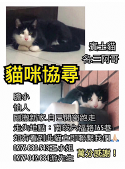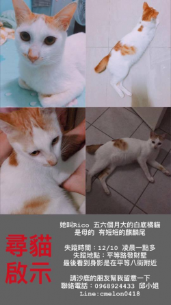 尋找貓咪~三阿哥 地點 桃園市蘆竹區 Luzhu , Taoyuan 【尋找貓咪~三阿哥 地點 桃園市蘆竹區】 轉貼內容12/13貓咪走失了在桃園南崁六福路這邊(>﹏﹏... [閱讀更多]