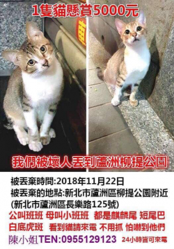 尋找貓咪~ 地點 新北市蘆洲區 Luzhou , New Taipei 【尋找貓咪~ 地點 新北市蘆洲區】 轉貼內容疑似丟貓地點:新北市蘆洲柳提公園,長樂路125號聯絡人:陳小姐TEL:0955129123(24小時皆可來電)…https://twpetsearch.arlinks.net/2018/12/luzhou-new-taipei.html ...... [閱讀更多]