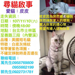 尋找美國短毛貓~皮皮 地點 台北市士林區 Shilin , Taipei ,American Shorthair 【尋找美國短毛貓~皮皮 地點 台北市士林區】 轉貼內容麻煩大家幫幫忙找我家皮皮!我老婆哭了三天了…如有尋獲禮金10000答謝…謝謝?聯絡電話 095876980909556621990922731781…https://twpetsearch.arlinks.net...... [閱讀更多]
