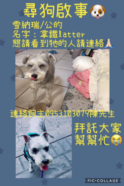 尋找雪納瑞~拿鐵 地點 南投縣竹山鎮 Zhushan , Nantou ,Schnauzer 【尋找雪納瑞~拿鐵 地點 南投縣竹山鎮】 轉貼內容尋狗啟事?走失時間:11/10大約下午四點至五點走失地點:南投縣竹山鎮大鞍里頂林14K處品種:雪納瑞/公的/7歲/未結紮/無晶片名字:拿…https://twpetsearch.arlinks.net/2018/11/zhushan-n...... [閱讀更多]
