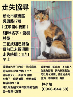 尋找貓咪~瀧櫻 地點 新北市板橋區 Banqiao , New Taipei 【尋找貓咪~瀧櫻 地點 新北市板橋區】 轉貼內容#走失協尋新北市板橋區吳鳳路17巷(江翠國中後面)貓咪名字:瀧櫻特徵:三花成貓已結紮目前已未戴項圈聯絡人:林小姐 0968844158…https://twpetsearch.arlinks.net/2018/11/banqiao-new-taipei....... [閱讀更多]