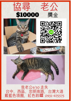 尋找貓咪~老公 地點 台中市西區 West , Taichung 【尋找貓咪~老公 地點 台中市西區】 轉貼內容走失一個多月了,好想抱老公吸不到老公的味道 整個人在顫抖了請大家幫幫忙台中 西區 虎斑貓藍色項圈 紅色鈴鐺請幫我們破鏡重圓謝謝妳們 也祝福所有走失的孩子 能趕快…https://twpetsearch.arlinks.net/2018/11/west-taichung...... [閱讀更多]