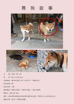 尋找柴犬~86 地點 花蓮縣吉安鄉 Ji』an , Hualien ,ShibaInu 【尋找柴犬~86 地點 花蓮縣吉安鄉】 轉貼內容聯絡電話 0905110592 0937175040 038-529591…http://twpetsearch.arlinks.net/2018/10/86-jian-hualien-shibainu.html ...... [閱讀更多]