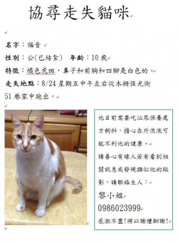尋找貓咪~福音 地點 台北市文山區 Wenshan , Taipei 【尋找貓咪~福音 地點 台北市文山區】 轉貼內容協尋貓咪 名字:福音 性別:公(已結紮) 年齡:10歲特徵:橘色虎斑,鼻子和前胸和四腳是白色的。走失地點:8/24星期五中午左右從木柵恆光街51巷家中跑出。…http://twpetsearch.arlinks.net/2018/08/wenshan-tai...... [閱讀更多]