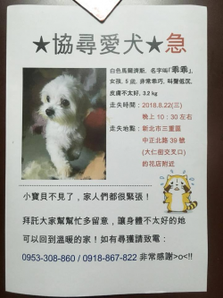 尋找馬爾濟斯~乖乖 地點 新北市三重區 Sanchong , New Taipei ,Maltease 【尋找馬爾濟斯~乖乖 地點 新北市三重區】 轉貼內容拜託大家留意+分享?♀️?♂️非常感謝?聯絡電話 0953308860 0918867822…http://twpetsearch.arlinks.net/2018/08/sanchong-new-taipei-malt...... [閱讀更多]