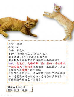 尋找貓咪~ 地點 宜蘭縣宜蘭市 Yilan , Yilan 【尋找貓咪~ 地點 宜蘭縣宜蘭市】 轉貼內容尋找文??公橘貓 鼻頭有一顆小痣大約3公斤 6個月大 麒麟尾 沒有植晶片他很親人但又有點膽小因為他不喜歡項圈所以沒幫他戴大概是8/14號晚上遺失的請各位如果有見著 …http://twpetsearch.arlinks.net/2018/08/yilan-yilan.html...... [閱讀更多]