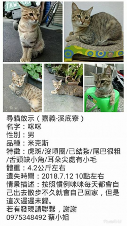 尋找貓咪~咪咪 地點 嘉義縣民雄鄉 Minxiong , Chiayi 【尋找貓咪~咪咪 地點 嘉義縣民雄鄉】 轉貼內容尋貓啟示好心人幫忙轉傳,謝謝!— 在嘉義縣民雄區。連絡電話 0975348492 0968768415…http://twpetsearch.arlinks.net/2018/08/minxiong-chiayi.html ...... [閱讀更多]