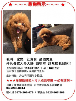 尋找紅貴賓~家樂 地點 台中市北區 North , Taichung ,Poodle 【尋找紅貴賓~家樂 地點 台中市北區】 轉貼內容希望朋友們互相幫助轉發一下,這樣我家狗狗才有希望回來自己的家來,感恩!聯絡電話 04 22368614 0979202679 0925967588…http://twpetsearch.arlinks.net/2018/07/north-taic...... [閱讀更多]