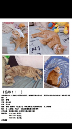 尋找貓咪~嚕嚕 地點 新北市樹林區 Shulin , New Taipei 【尋找貓咪~嚕嚕 地點 新北市樹林區】 轉貼內容家裡貓咪在日跨一的凌晨四點從社區大樓間窗戶跳出去 有看到可以打圖片中的聯絡電話 ???遺失地點在新北樹林俊保路口、俊英街這聯絡電話 0979574433…http://twpetsearch.arlinks.net/2018/05/shulin-new-t...... [閱讀更多]