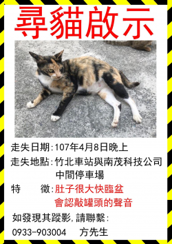 尋找貓咪~ 地點 新竹縣竹北市 Zhubei , Hsinchu 【尋找貓咪~ 地點 新竹縣竹北市】 轉貼內容請問可幫忙轉發分享? 走失日期:107年4月8日走失時間:晚間8點左右走失走失地點:竹北車站 與 南茂科技公司中間停車場特徵:肚子很大快臨盆了,會認敲罐頭的聲音如發…http://twpetsearch.arlinks.net/2018/04/zhubei-hsin...... [閱讀更多]