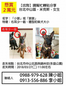 尋找狗狗~小狼 地點 台北市中山區 Zhongshan , Taipei