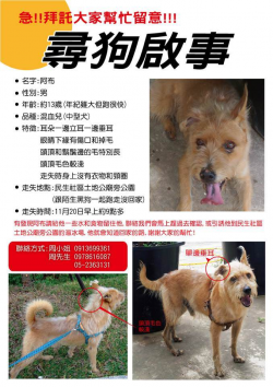 尋找狗狗~阿布 地點 嘉義縣水上鄉 Shuishang , Chiayi