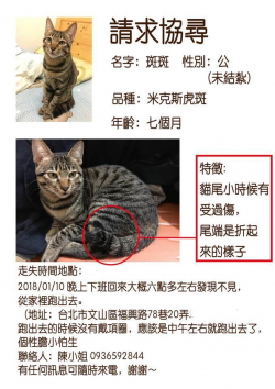 尋找貓咪~斑斑 地點 台北市文山區 Wenshan , Taipei 【尋找貓咪~斑斑 地點 台北市文山區】 轉貼內容拜託大家了 地點在台北試文山區福興路那裡 住在附近的朋友們 如果有看到疑似斑斑的話 一定要通知我們?????? 體型較瘦小 尾巴末端有個很不自然的彎曲 雖然在…http://twpetsearch.arlinks.net/2018/01/wenshan-taip...... [閱讀更多]