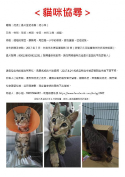 尋找貓咪~虎虎 地點 台南市永康區 Yongkang , Tainan 【尋找貓咪~虎虎 地點 台南市永康區】 轉貼內容<貓咪協尋文>#麒麟尾母虎斑貓大約快1歲成貓#走失地點台南市永康區復興路33巷#看到此貓請幫忙留住安置並私訊通知我會安排時間去帶回#晶片號碼9001380009…http://twpetsearch.arlinks.net/2018/01/yongkang-tain...... [閱讀更多]