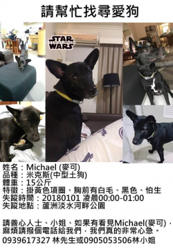 尋找狗狗~Michael 地點 新北市蘆洲區 Luzhou , New Taipei 【尋找狗狗~Michael 地點 新北市蘆洲區】 轉貼內容請幫忙找尋愛狗,2018年跨年夜在蘆洲淡水河畔公園走失,有看到的人請跟我聯絡,謝謝 0939617327林0905053506…http://twpetsearch.arlinks.net/2018/01/michael-luzhou-new...... [閱讀更多]