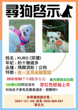 尋找瑪爾濟斯~Kuro 地點 桃園市中壢區 Zhongli , Taoyuan ,Maltease 【尋找瑪爾濟斯~Kuro 地點 桃園市中壢區】 轉貼內容???已經5天了 都沒有消息 怎麼辦?若有人拾獲 請還給我們 他是老狗了 也不好照顧若是流浪中 請幫他回家 我們很愛他 謝謝您大愛?請幫忙協尋 內壢家樂福公園 內壢國小國中高中署桃一帶 請幫忙分享?有明顯剪耳 頸背有顆小肉瘤 未結...... [閱讀更多]
