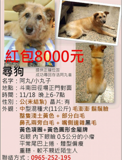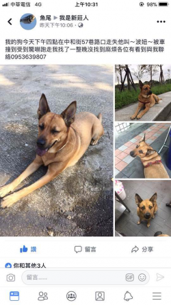 尋找狗狗~波妞 地點 新北市新莊區 Xinzhuang , New Taipei 【尋找狗狗~波妞 地點 新北市新莊區】 轉貼內容兄弟的毛小孩(波妞)昨天下午4點多在新莊中和街走失,麻煩各位善心人士幫忙找一下,感謝,余先生:0953639807http://twpetsearch.arlinks.net/2017/11/xinzhuang-new-taipei.html ...... [閱讀更多]