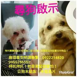 尋找瑪爾濟斯~團團 地點 台中市北屯區 Beitun , Taichung ,Maltease 【尋找瑪爾濟斯~團團 地點 台中市北屯區】 轉貼內容我家的團團走失了(瑪爾混貴賓)奶茶色偏白、公的沒有結紮!很瘦!未帶項圈!,昨天下午1點23分在台中市北屯區松竹路二段160巷走丟了!有人看到可以聯絡我嗎,感恩感恩!!!!牠走丟一定會很慌張越走越遠,希望好心人士看到可以通知我一下!!拜託拜...... [閱讀更多]